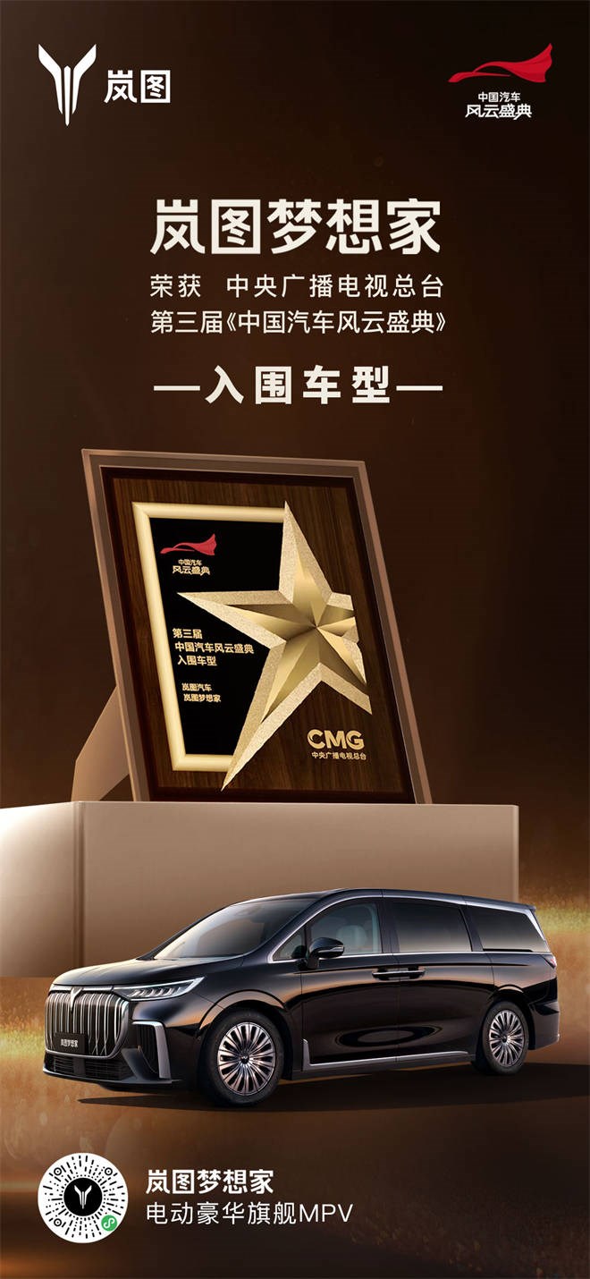 2月24日,由中央廣播電視總臺主辦的第三屆《中國汽車風(fēng)云盛典》入圍發(fā)布儀式在江蘇鹽城舉行。嵐圖夢想家憑借超越同級的駕控體驗(yàn)和全方位的極致安全入圍此次評選。這也是嵐圖汽車兩年蟬聯(lián)《中國汽車風(fēng)云盛典》入圍車型。2022年,性能級智能電動SUV嵐圖FREE曾以五項(xiàng)第一的成績奪得桂冠,獲得“評委會大獎”。