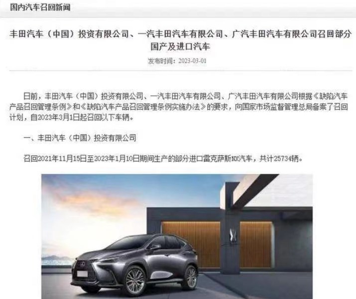 另外,剛剛過去的2月、3月,雷克薩斯連續(xù)2次發(fā)布召回公告,第一次原因是燃油箱通風(fēng)管外殼(樹脂材料)上部的形狀不當(dāng),使用時(shí)可能存在風(fēng)險(xiǎn);第二次原因?yàn)榘踩{駛輔助系統(tǒng)中前置攝像頭內(nèi)部程序不當(dāng)。